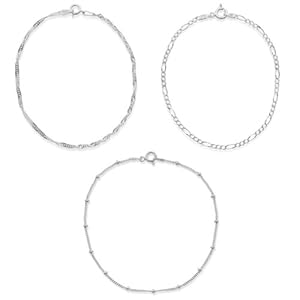 Sterling Silver Set of Three: Twisted 035-Gauge Singapore, 060-Gauge Figaro and Thin Link with Bead Stations Chain Bracelets, 7"